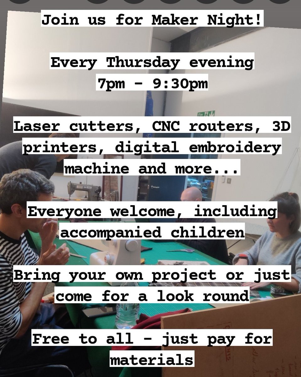 Our free regular evening meetup where you can find out about our space and all the making equipment in it, get a laser cutter or CNC embroidery machine induction, and work on projects from physical computing and electronics to 3d printing, routing and sewing. Just pay for materials used. |
