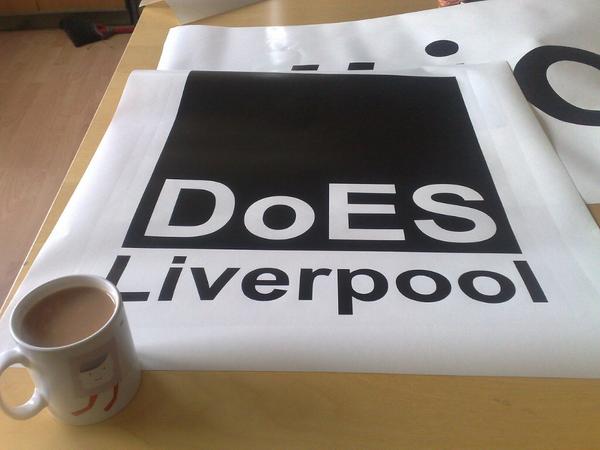 - Adrian McEwen: Second vinyl cut piece: a DoES Liverpool logo. Cup of tea for scale. And drinking. #weeknotes pic.twitter.com/riS3EIjjyU