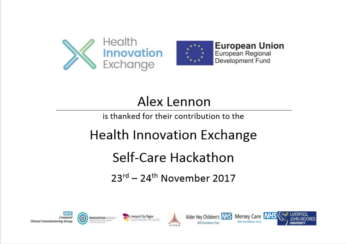 - Alex Lennon: My first #hackathon last week was a really positive and enjoyable experience. Meeting some great people and understaking some interesting challenges. Winning didn’t hurt either! I look forward to more of the same #schack #selfcare #weeknotes @LJMUinnovation pic.twitter.com/TqTXEnASXb