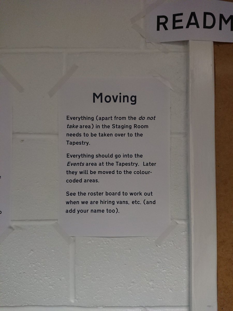 There are lots of things to do, both with the move and in preparation for the move. If you want to help out, check the DoES Move The Tapestry label on the Somebody Should issue list, or get in touch.