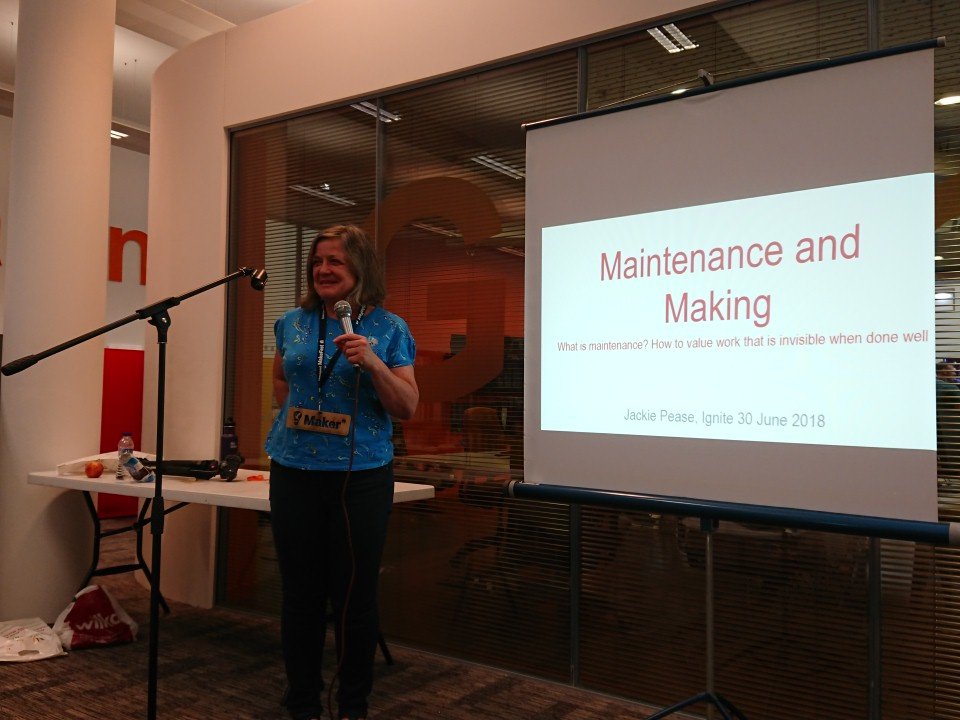 - Ross Dalziel: Here’s Jackie Pease Making #Maintenance visible and celebrating it Ignite Liverpool join us! Festival of Maintenance in London Sat Sept 23rd live streamed #weeknotes DoES Liverpool Liverpool MakeFest