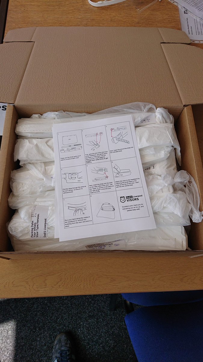 - Adrian McEwen: Loving our new packing boxes. They fit 500 in perfectly 👌 This box takes us over 4000 #COVID19 visors shipped from DoES Liverpool 🎉✊ #weeknotes pic.twitter.com/lExJiNHLRu